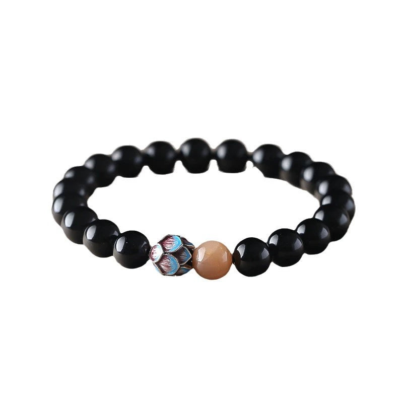 The Natural Obsidian Lotus Beaded Bracelet is a beautiful and meaningful accessory crafted from genuine obsidian and lotus-themed beads. Obsidian, a volcanic glass stone, is known for its protective and grounding properties, symbolizing strength, clarity, and spiritual growth. The lotus design represents purity, enlightenment, and resilience, as the lotus flower rises from muddy waters to bloom into a thing of beauty. This bracelet combines the powerful energies of obsidian with the serene symbolism of the lotus, making it a perfect choice for those seeking protection, inner peace, and spiritual balance.